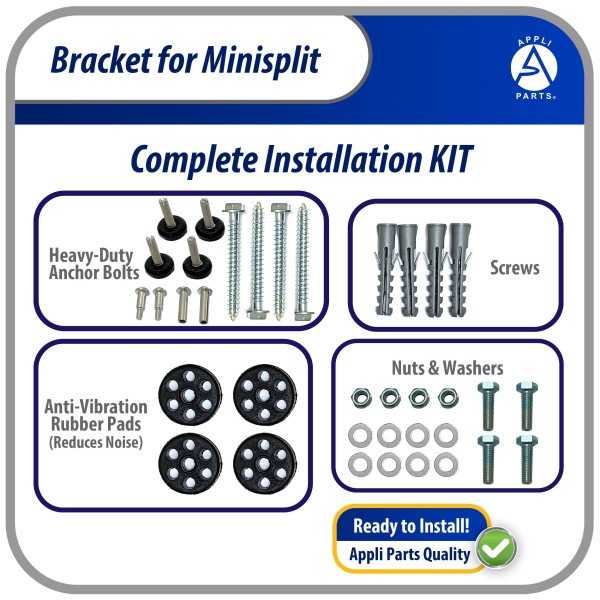 Appli Parts APAB-3160 Mini Split Wall Mounting Bracket, Heavy Duty Outdoor Support Up to 352 lbs. Fit 5000 to 36000 BTU Units, Includes Level Cross Bar, Anti Vibration Pads and Full Installation Kit