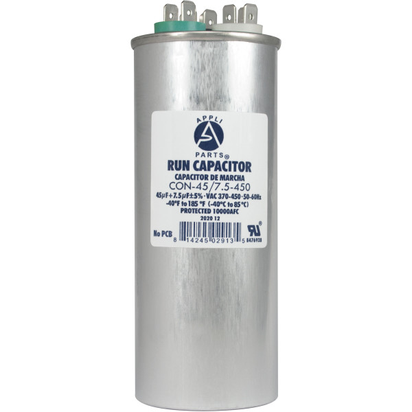 Appli Parts CON-45/7.5-450 Dual Run Capacitor for ac 45+7.5 Mfd uF (microfarads) 370VAC or 450VAC CBB65 Round Universal fit for hvac and other applications 5-3/8 in High 2 in Wide