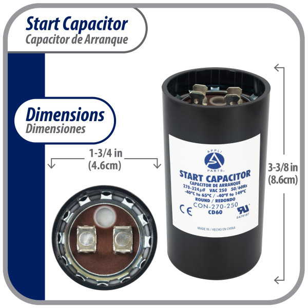 Appli Parts CON-270-250 Motor Start Capacitor 270-324 MFD uF, 250 VAC. Universal for Electric Motor Applications, 1.75 in Wide, 3.38 in Height