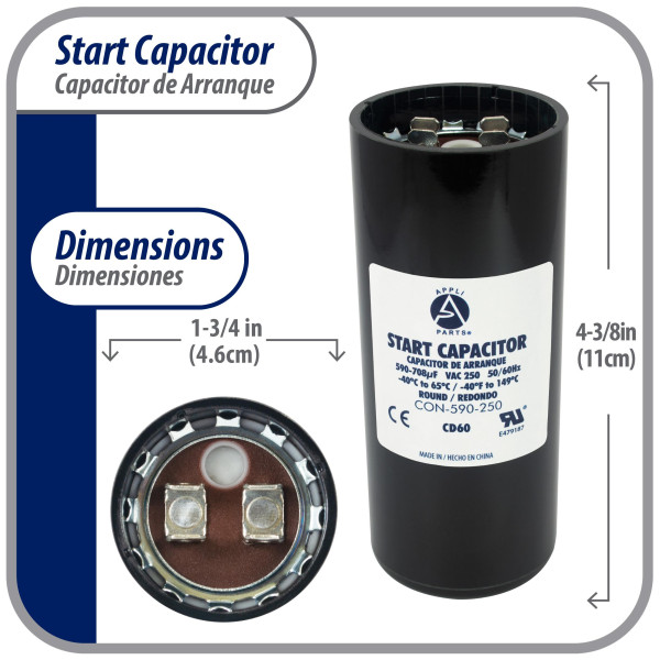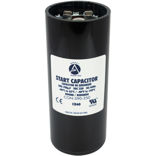 Appli Parts CON-590-250 Motor Start Capacitor 590-708 MFD uF, 250 VAC. Universal for Electric Motor Applications, 1.75 in Wide, 4.38 in Height